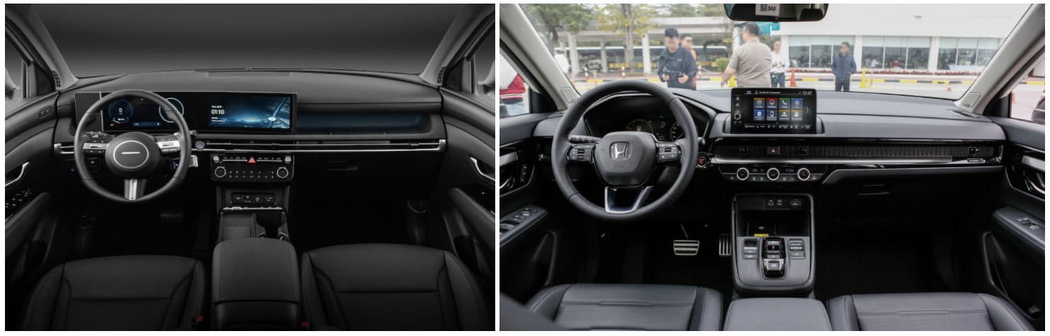 Ở góc độ nội thất, Honda CR-V có sự khác biệt so với đối thủ Tucson ở chỗ, dòng xe CR-V thiên về sự tiện dụng và cao cấp với HUD, cụm đồng hồ 10,2 inch và bố trí tối ưu cho người lái. Phía Tucson tuy nhiên không phải kém cạnh, khi dòng xe từ thương hiệu Hàn Quốc lại vượt trội về công nghệ hiển thị với màn hình cong kép 12,3 inch. Các trang bị nội thất của Tucson cũng thể hiện cách thiết kế hiện đại và nhiều tiện nghi như đèn nội thất 64 màu hay âm thanh Bose.